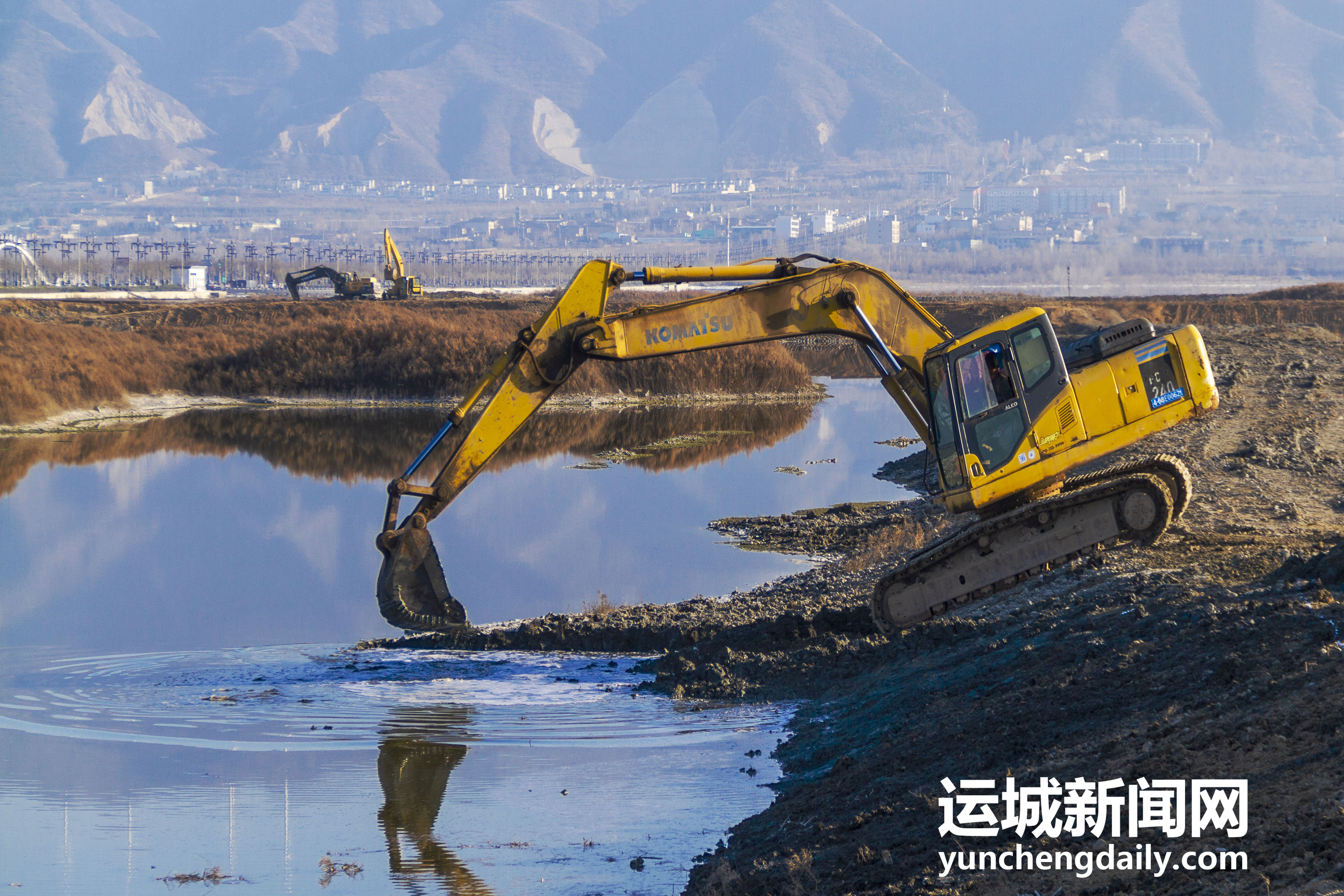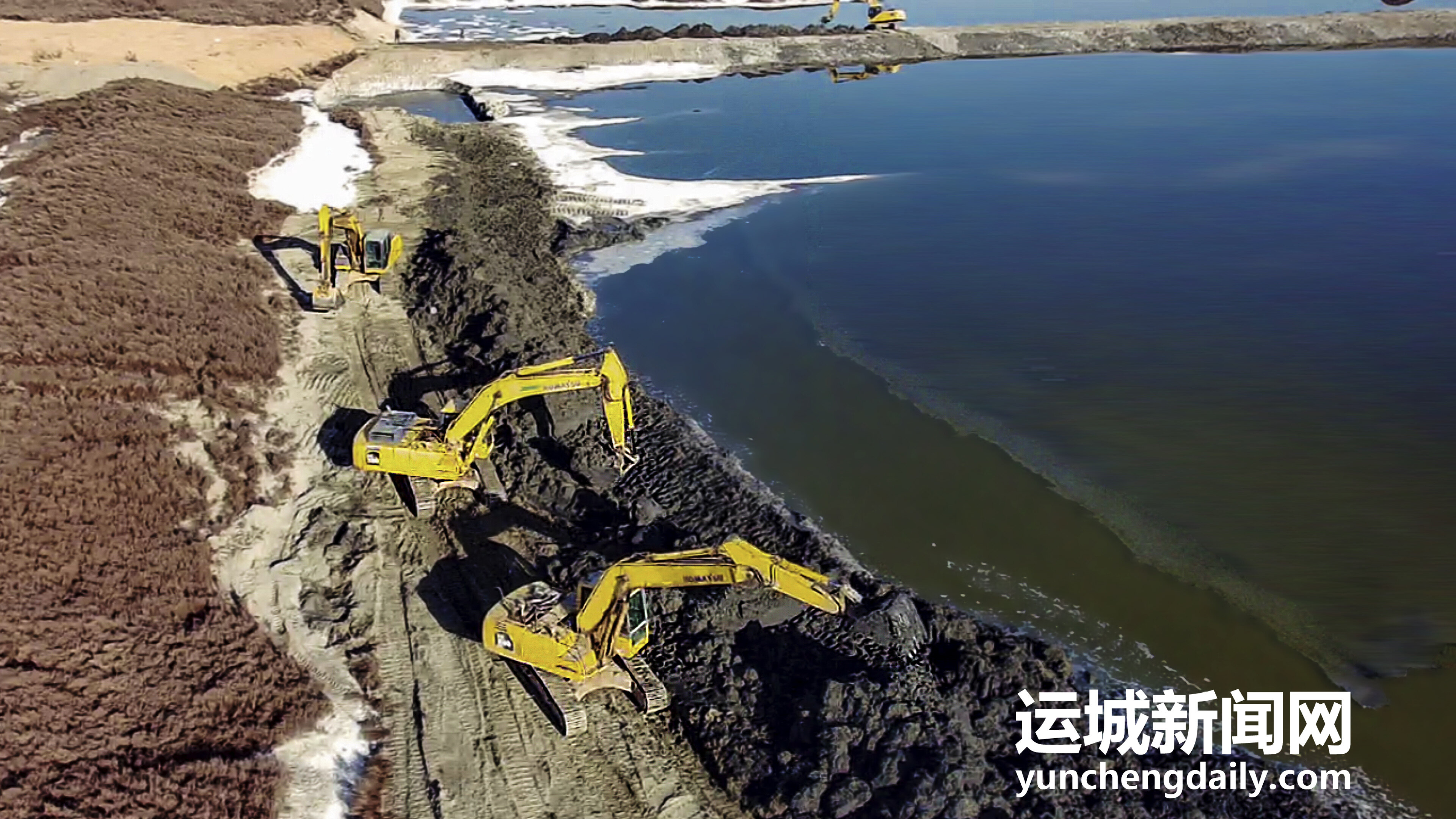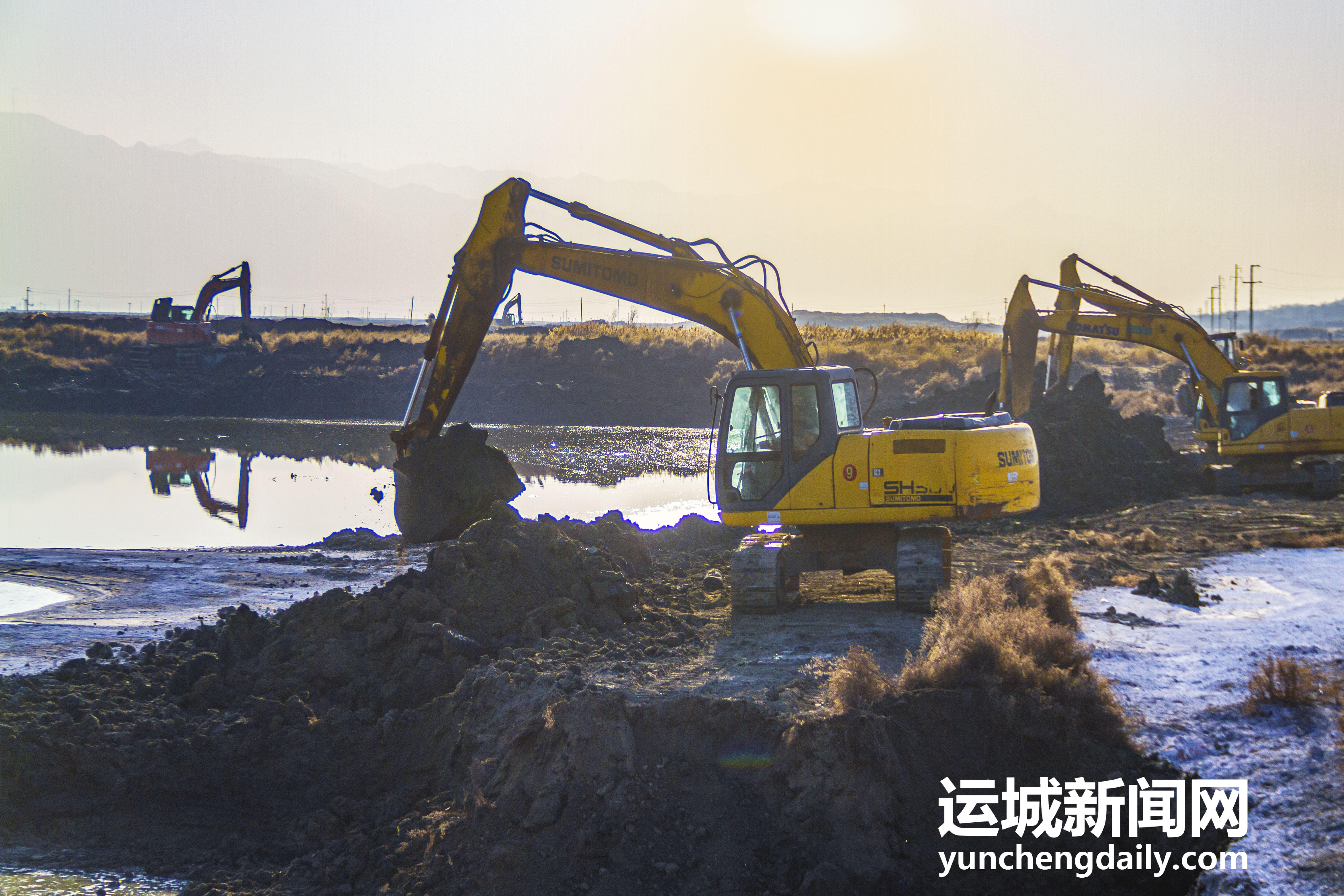 2022年12月18日,鹽湖景區(qū)內(nèi),工人師傅正在對堤埝進(jìn)行除險加固。